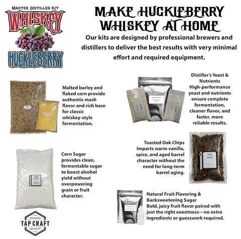 Experience the wild, tart-sweet flavor of huckleberries in a smooth whiskey-style spirit with the Tapcraft Huckleberry Whiskey Recipe Kit. Designed for hobby distillers, this DIY mash kit features a blend of crushed barley malt, corn sugar, flaked corn, and natural huckleberry flavoring. Includes 8oz of backsweetening sugar to finish your spirit with just the right touch of sweetness. A great project for any home distiller seeking something bold, distinct, and distinctly Northwest-inspired.