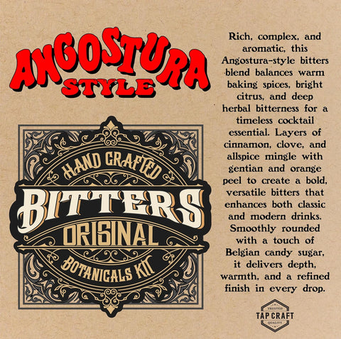 Craft classic Angostura-style bitters at home with this TAPCRAFT botanical blend kit. Designed for home mixologists and DIY cocktail makers, this blend includes gentian root, quassia, aromatic spices, citrus peel, and Belgian candi sugar for balanced sweetness. Simply add your preferred neutral spirit, steep, strain, and bottle using your own containers. This botanical blend produces a versatile aromatic bitters profile perfect for Old Fashioneds, Manhattans, whiskey cocktails, and modern craft cocktails. A convenient way to make small-batch bitters without needing bottles or accessories.