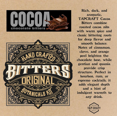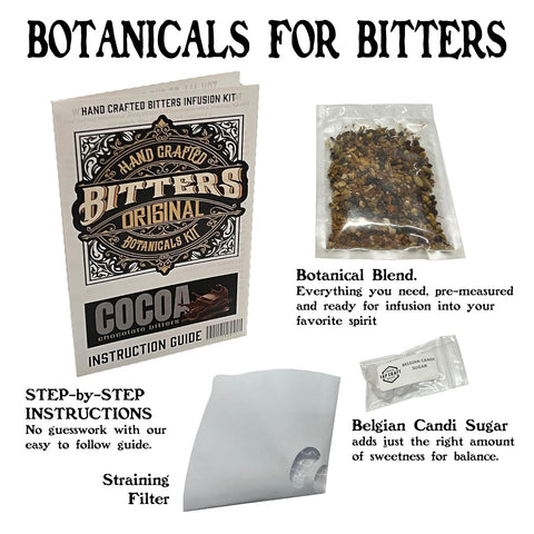 - Cocoa-forward bitters botanical blend for creating rich chocolate aromatic bitters at home.