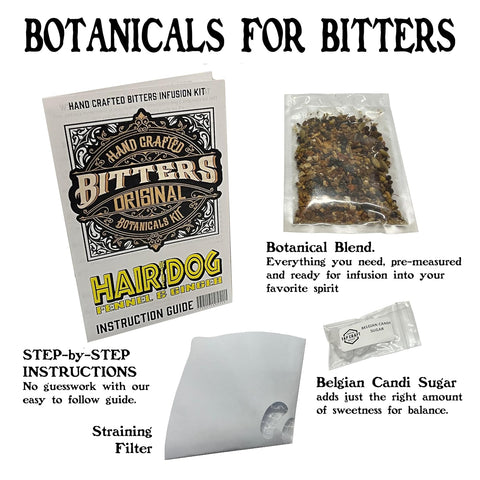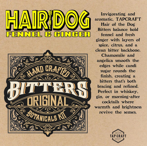 Create bold herbal bitters with the TAPCRAFT Hair of the Dog botanical blend kit. This infusion-ready mixture includes fennel seeds, ginger root, gentian, angelica, chamomile, citrus peel, and warm spices to produce a complex bitters profile with depth and aromatics. Simply combine the blend with your preferred neutral spirit, steep for one week, strain, sweeten with the included Belgian candi sugar, and bottle using your own containers. Ideal for enhancing whiskey cocktails, gin drinks, digestif-inspired recipes, and modern craft cocktails. A convenient option for home bartenders who want to make their own bitters without purchasing bottles.